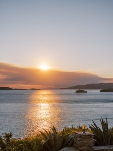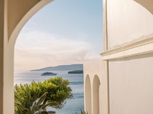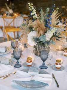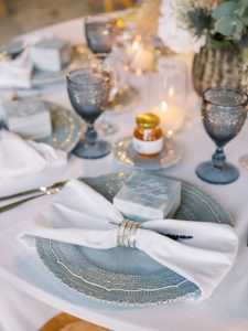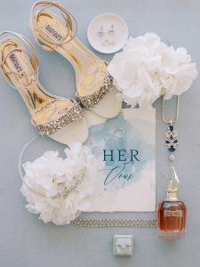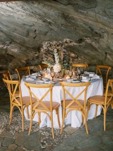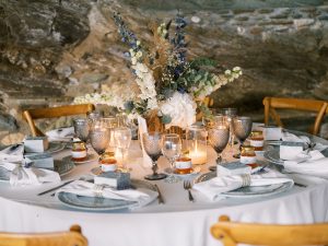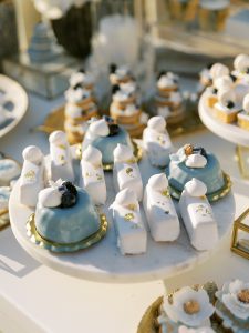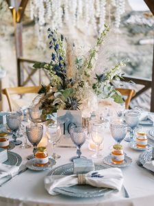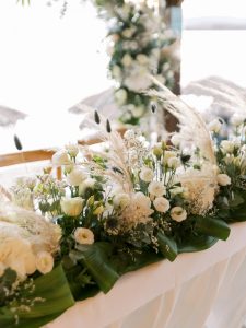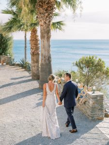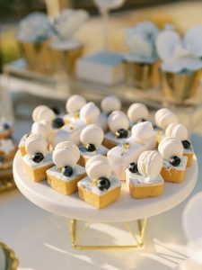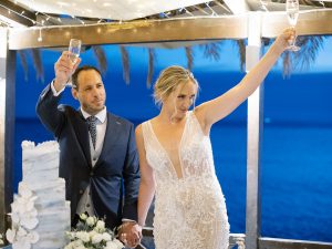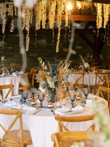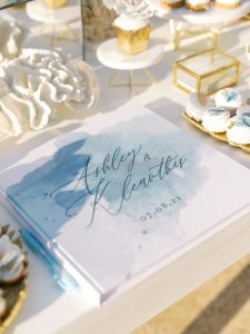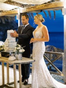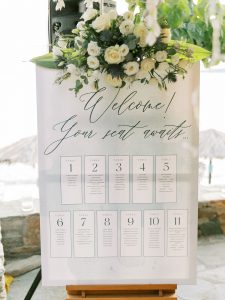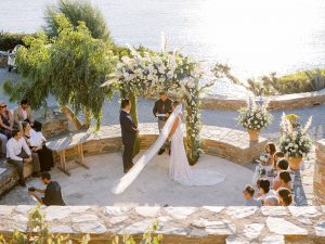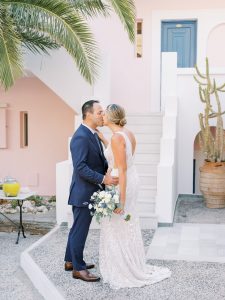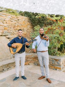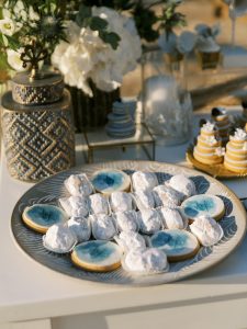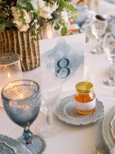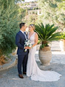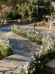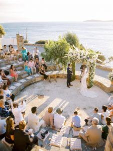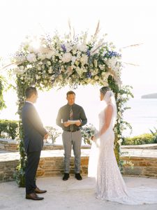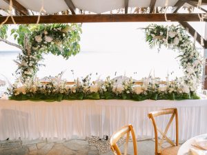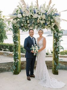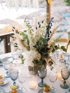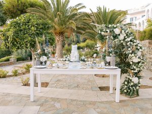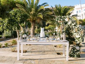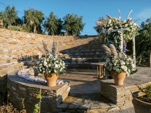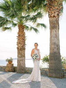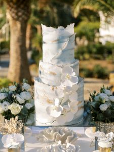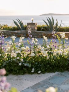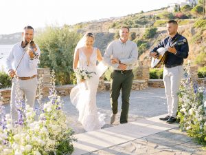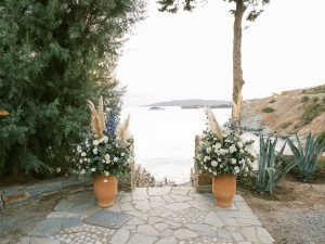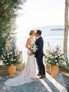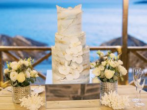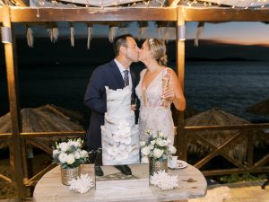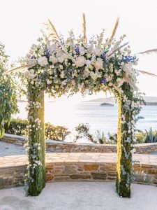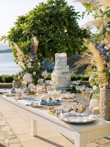 Our beautiful and beloved couple Ashley and Kleanthis travelled all the way from Philadelphia, USA to Greece and got married in Andros, the northernmost island of the Greek Cyclades archipelago. We chose a beautiful outdoor location for the wedding ceremony with a gorgeous view and then amplified its enchanting effect with a jaw-dropping flower arch. For a natural-meets-romantic setting, we created a flower aisle in which the blooms appeared as if they were growing from the ground. Beachy, but elegant! We created a beachside celebration that had the ultimate color inspiration – the ocean. Sophisticated aesthetic with relaxed design for a dessert table and cake for our island wedding. Hand-painted florals, watercolors, and subtle ruffles all evoked a timeless touch.