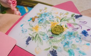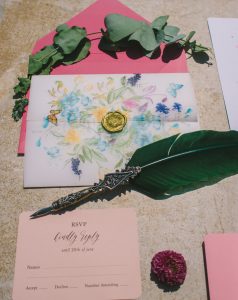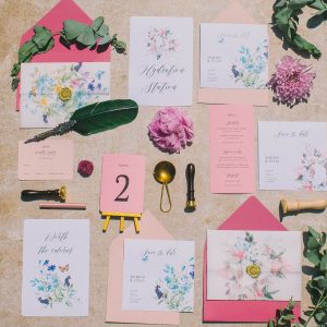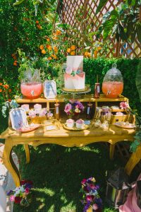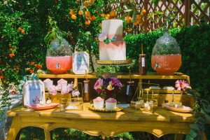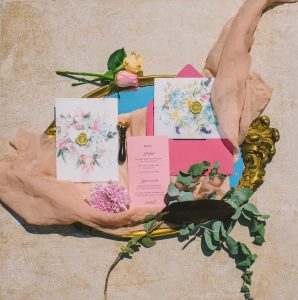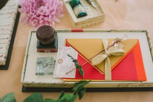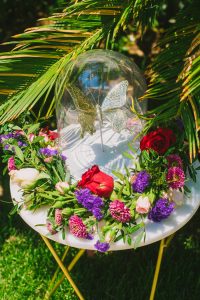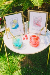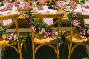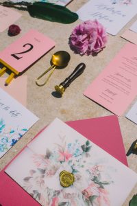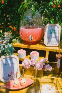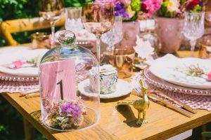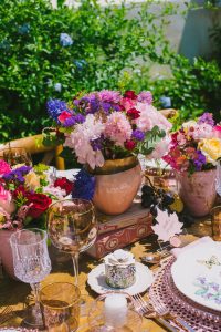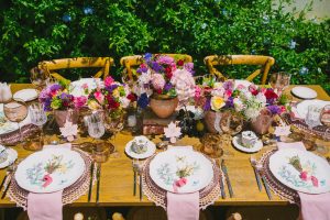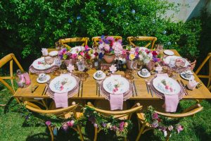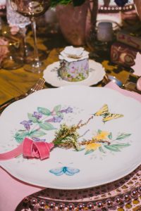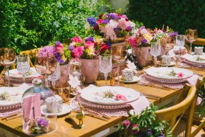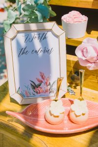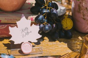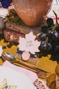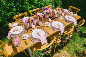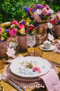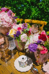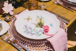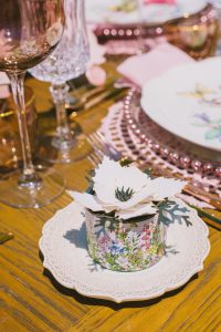 For this spring celebration we created a beautiful outdoor table with blossoms, candles and something pretty at each place setting. We adopted a bold approach with vibrant colors and patterns in order to produce a sophisticated and fun event that stands out. We always pay attention to every detail and in that mood we designed graphics for the party favors that matched the dinner plates that we picked according to our concept and we also fabricated unique name tags for every place setting in the shape of charming pink maple leaves.